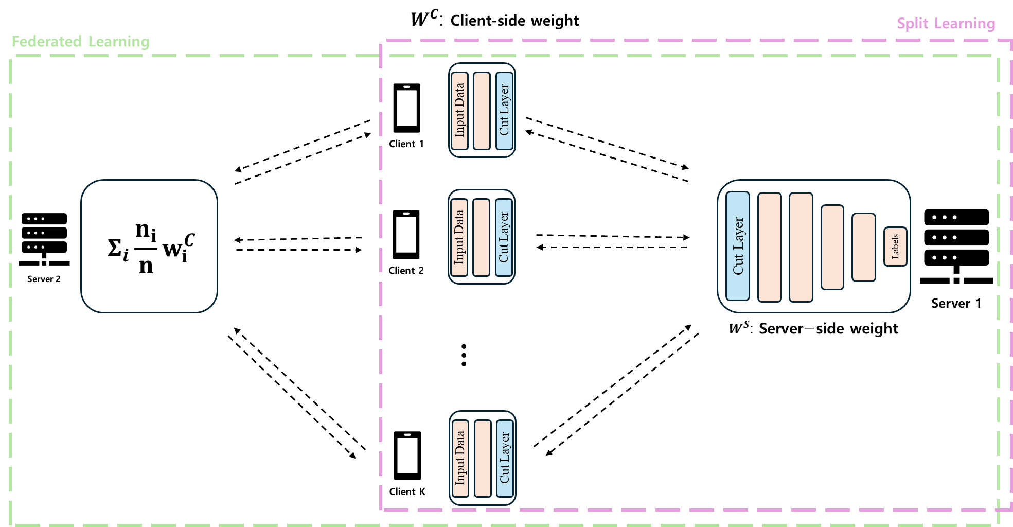 Intro SplitFed (SFL)은 Federated Learning (FL) & Split Learning (SL)을 합쳐놓은 방법론이다. 이 내용은 아래의 논문에 등장하는데, 호주 연방과학산업연구기구 (CSIRO)에서 출판한 논문이다. 사실 이 논문의 결과는 그닥 좋지 않다... Result 부분을 보고 리뷰할까 고민이 많이 됬던 논문이다. 뒤에 언급함... 그럼에도 읽다보니 구조적으로 활용하거나 여러 개념을 조립하여 적용 가능해보여서 결국 다 읽게 되었다. 여기 논문에서는 새로운 구조 제시와 privacy protecting methods에 집중하여 논문을 전개하는데, 오늘은 논문의 구조에 대해서만 집중하여 포스트를 올린다. 그리고 혹시 FL과 SL에 대해 잘 모르겠거나 읽다가 헷갈리신다면 아래..